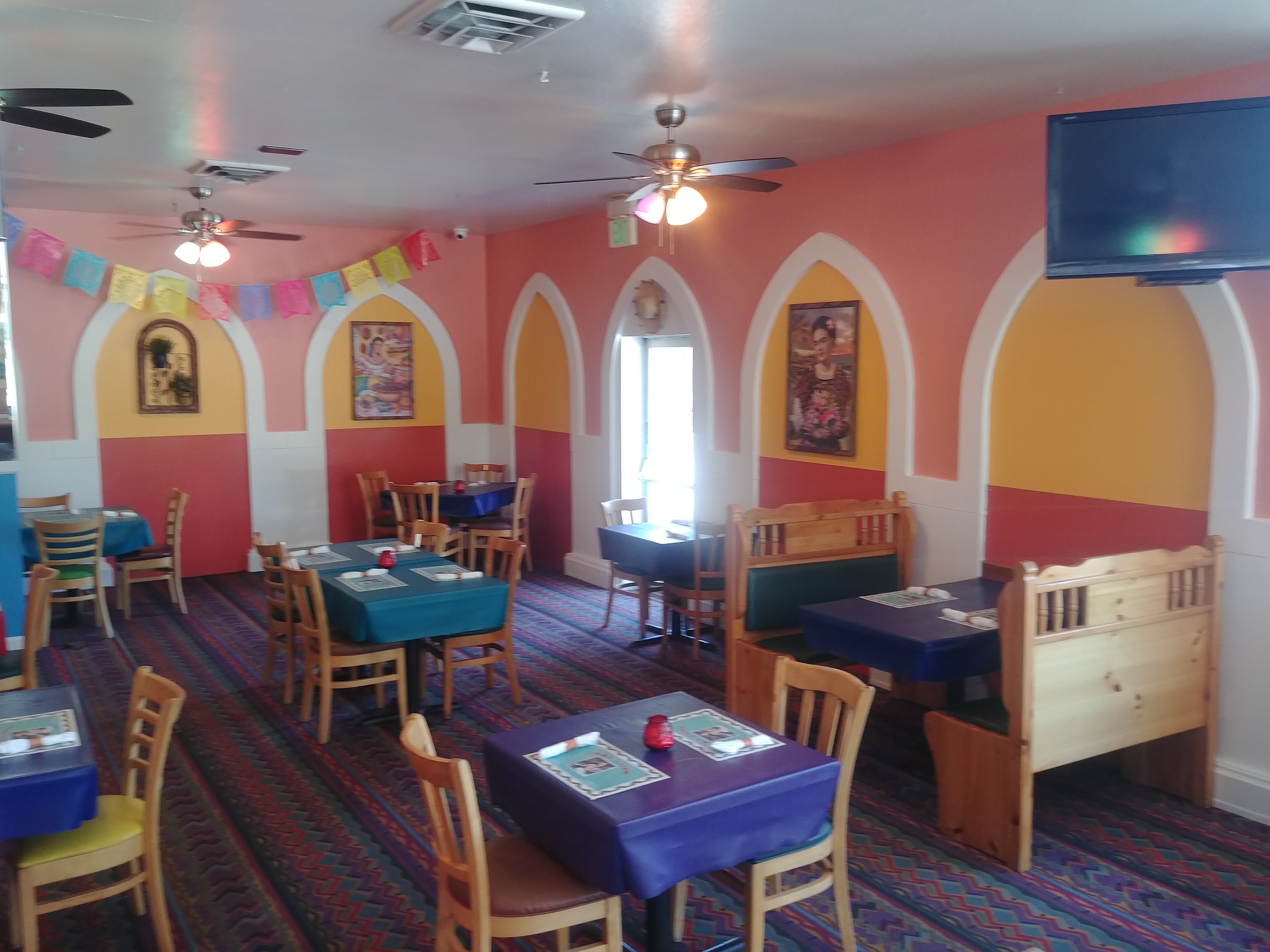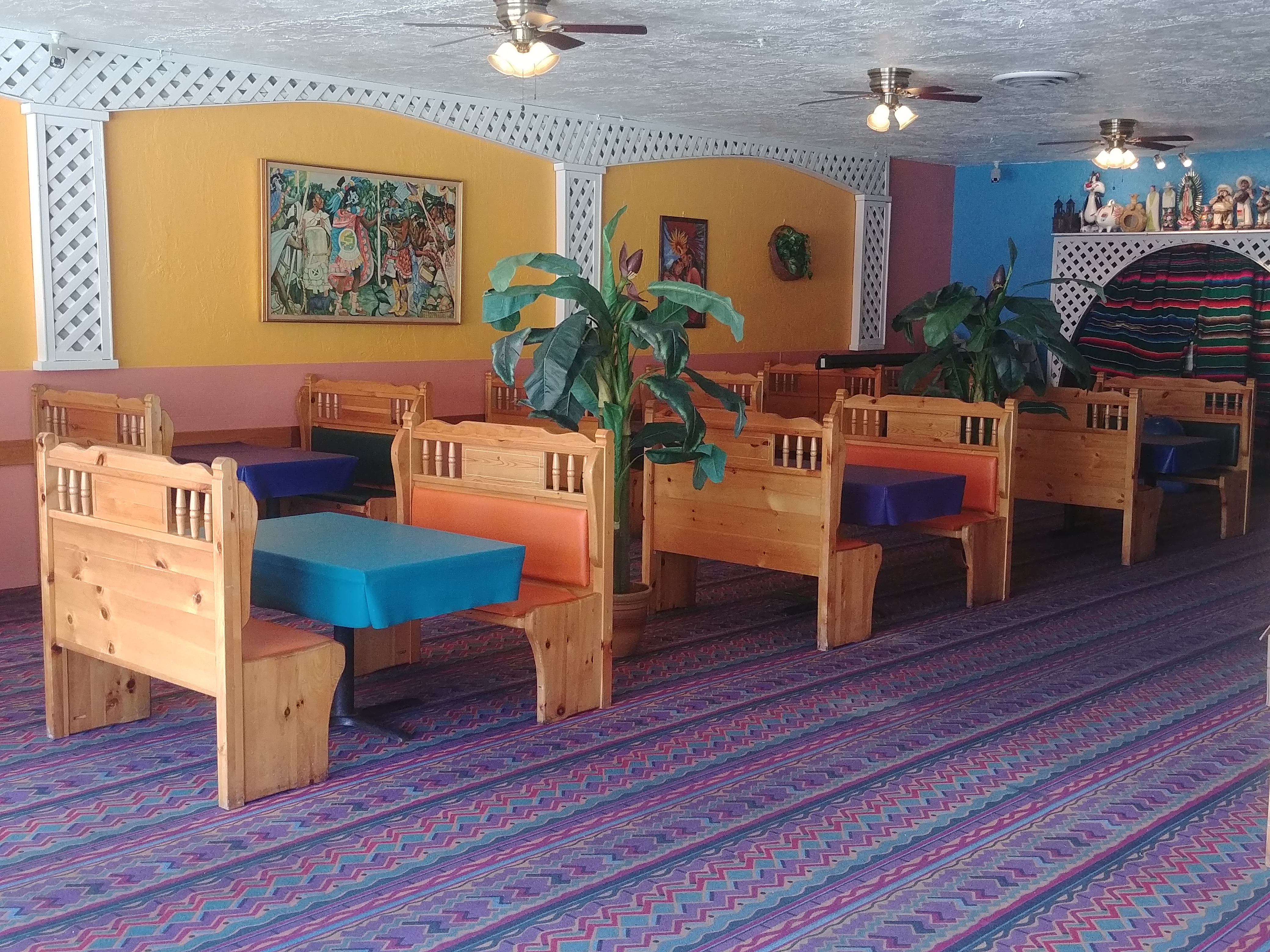 Inside our restaurant, tables have been spaced out 6 feet for social distancing.